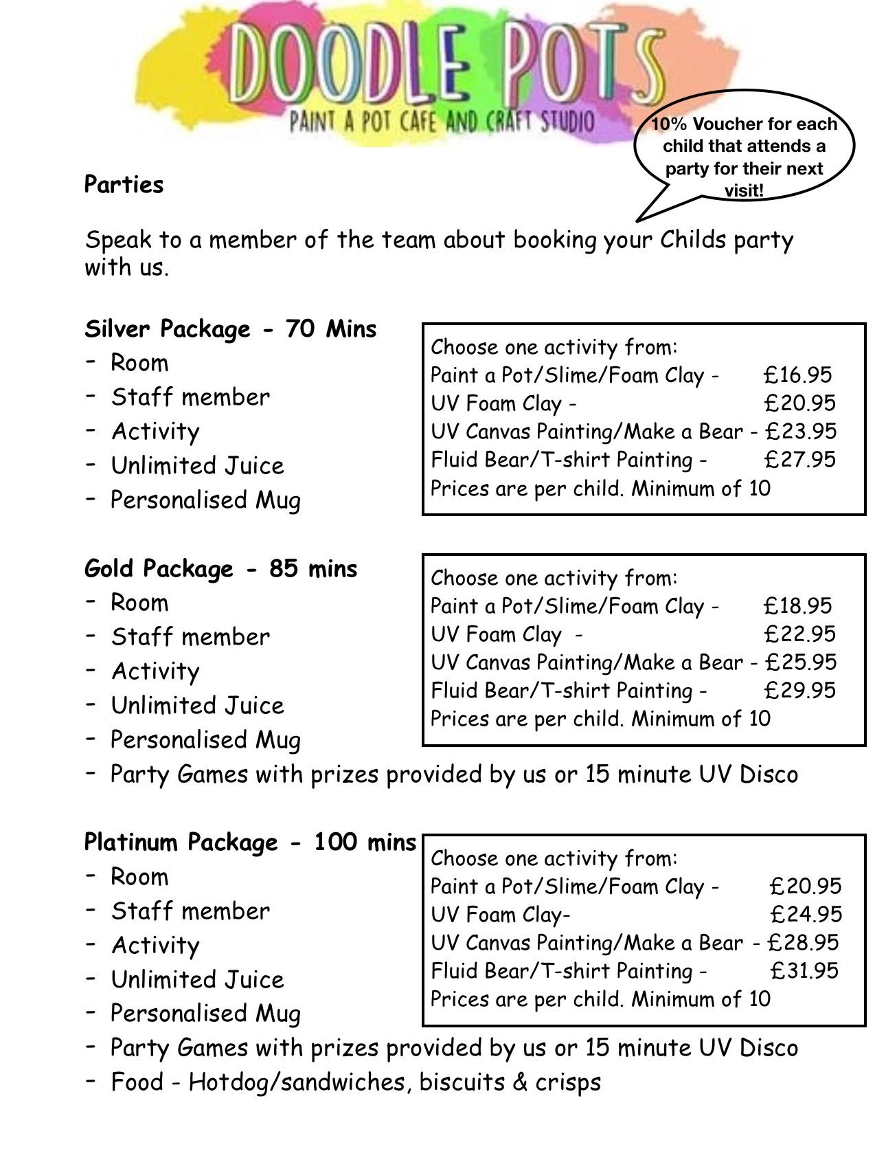 Choose from a selection of Party Pottery Items to paint on the day. these will then be glazed and fired and ready to collect at a later date.