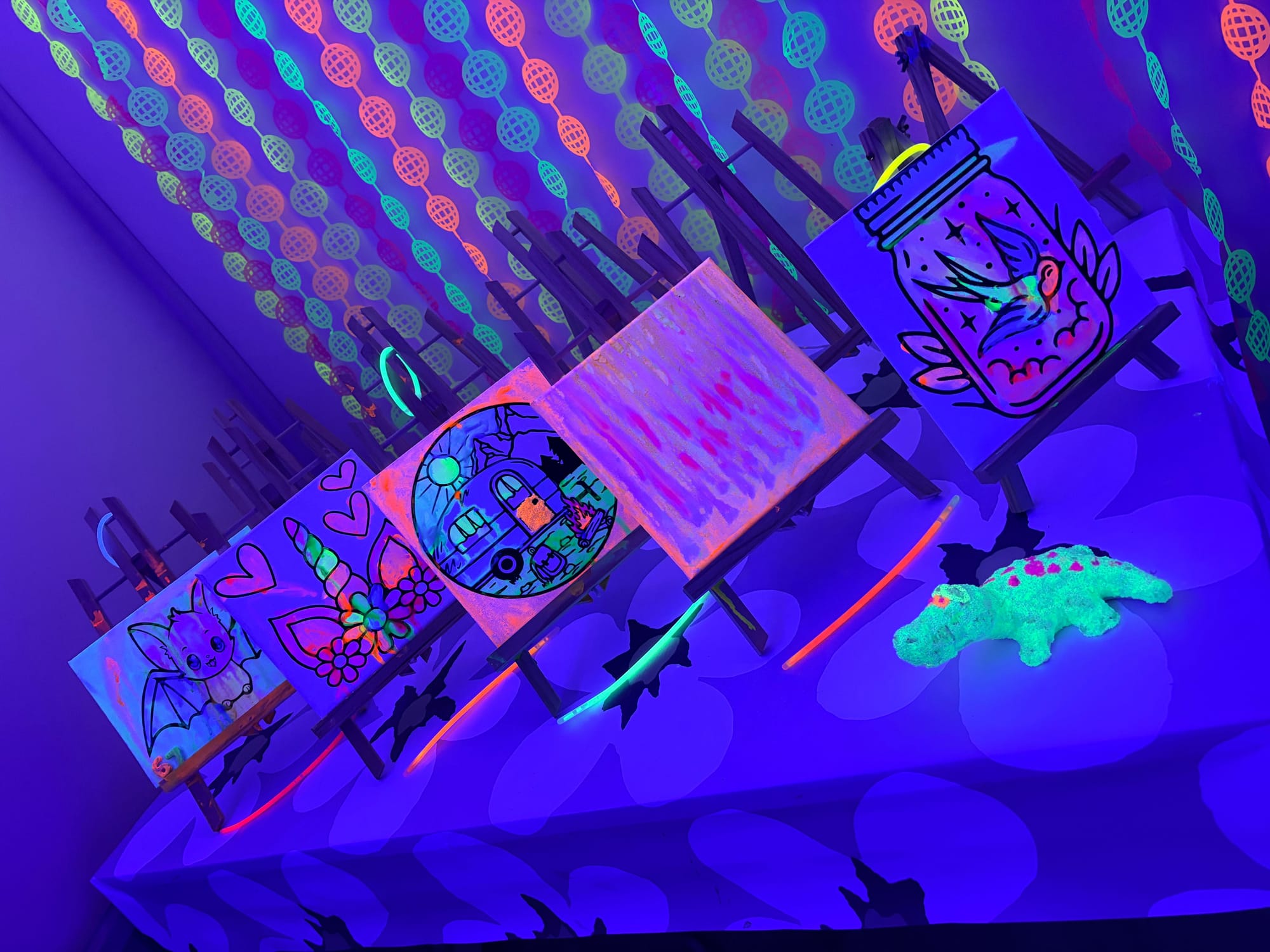 Choose your canvas design or go free hand and enjoy painting under UV light to watch your art glow. Enjoy other UV items such as face painting and glow sticks and take home your mini UV touch so you can look at your picture under UV light whenever you want